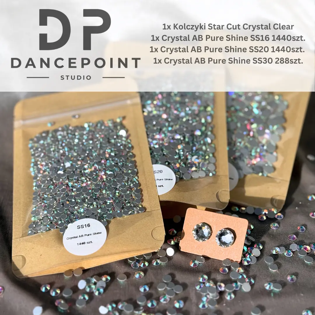 Idealny pomysł na prezent dla każdej tancerki! Zestaw zaweira najbardziej uniwersalne kamienie Crystal AB w najwyższej jakości wariancie Pure Shine, w trzech najczęściej używanych rozmiarach, oraz piękne kolczyki Star Cut, mieniące się niczym diamenty.h.